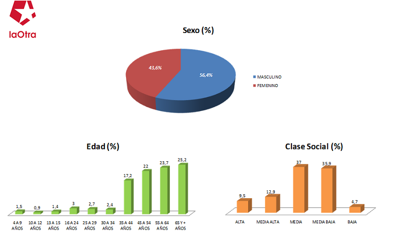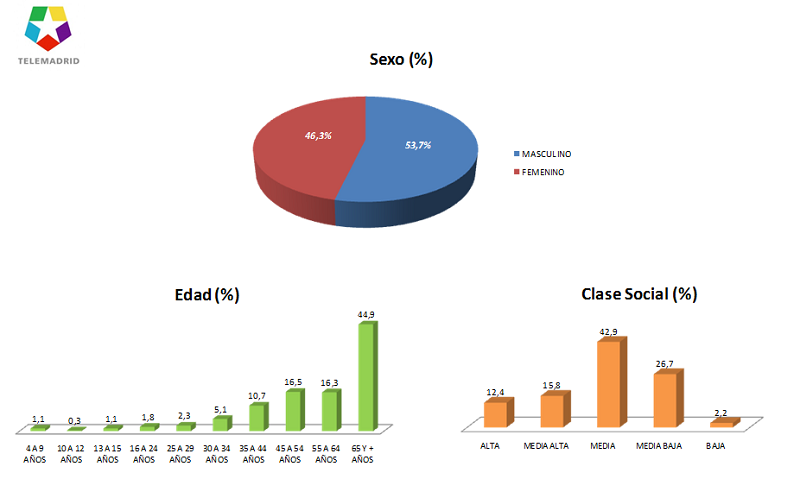 76,6% dos adultos que vêm a Telemadrid e a La Outra, são de classes Alta , Média Alta e Média. No caso das donas de casa, as classes altas representam 75.5%.