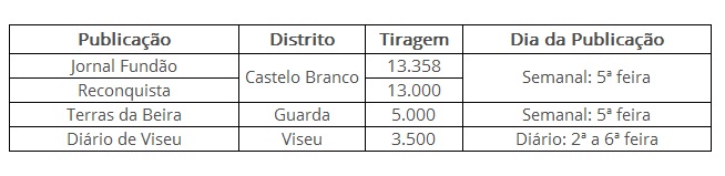 Esta oportunidade contempla os jornais regionais líderes de audiência dos principais distritos da Beira Interior: Castelo Branco, Guarda e Viseu.