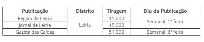 No total, esta oportunidade contempla 6 inserções, 2 em cada jornal e destina-se a empresas e empresários que pretendem divulgar os seus produtos e serviços no distrito de Leiria.
